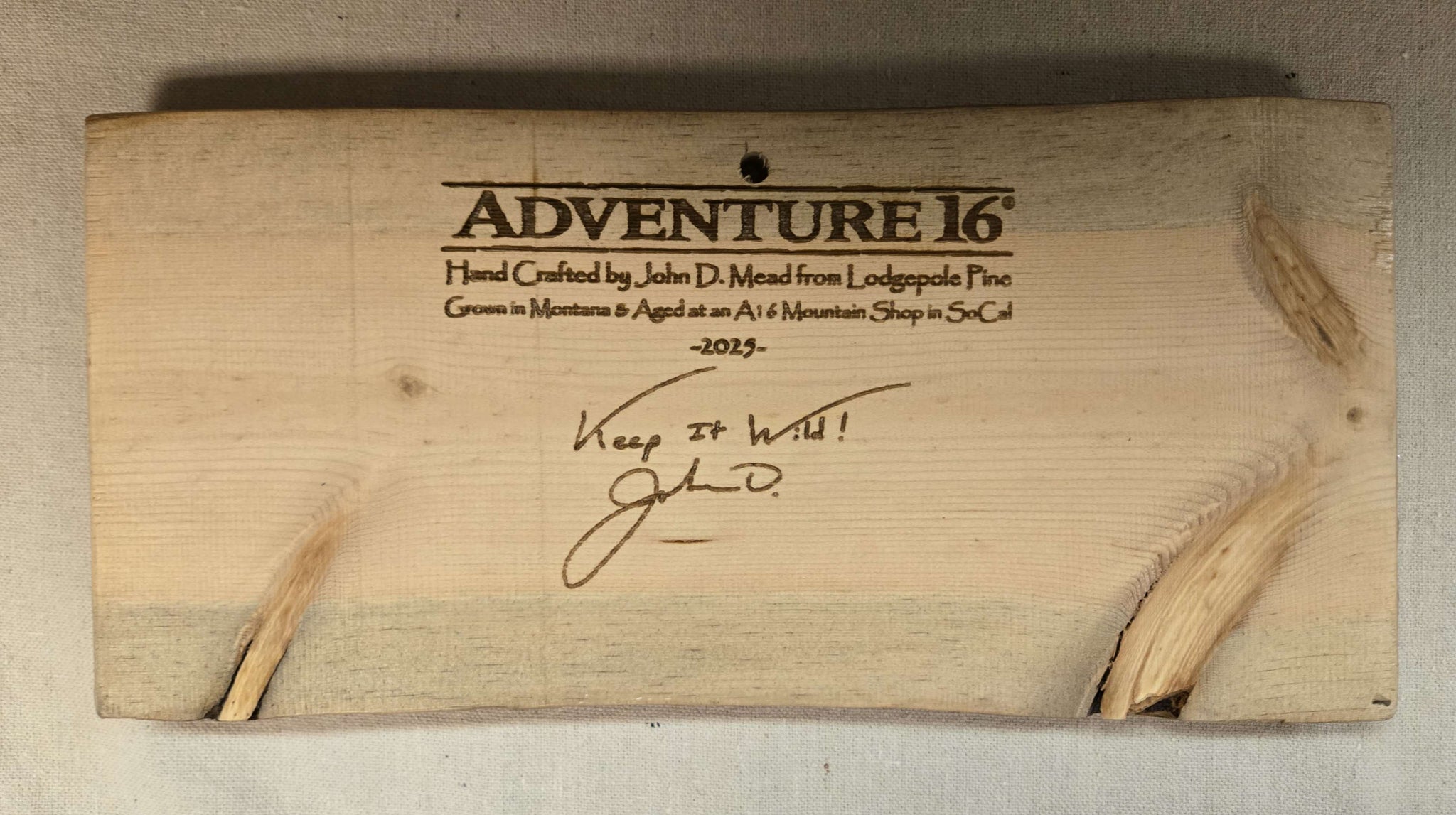 This wall art was cut and laser engraved from a slice of log reclaimed from one of the former A16 mountain shops. I've hand made each plank with the hope that it will inspire all who see it to explore and help preserve wilderness, and perhaps make the reader smile. -John D. Mead, Trail Boss @ A16