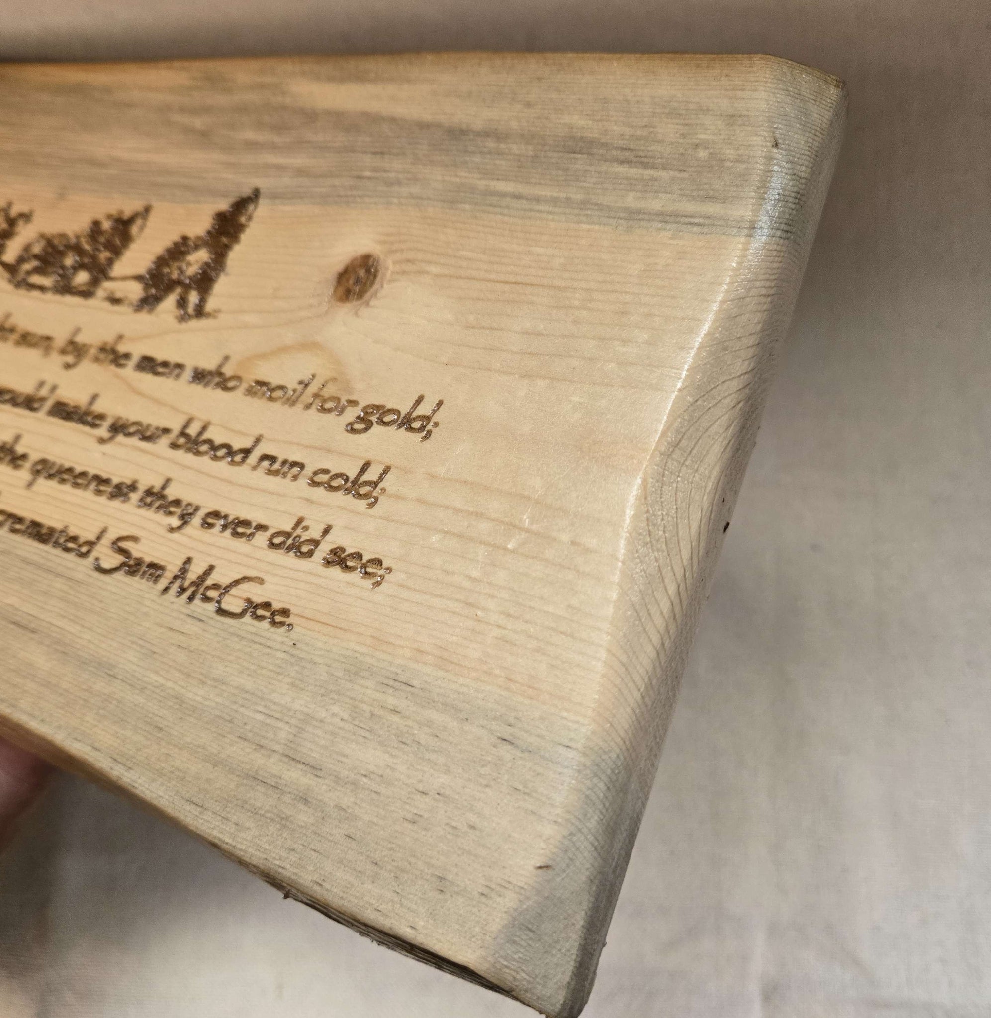 The Quote Planks are made from a Montana grown Lodge Pole Pine and repurposed from a log used for decor for several decades in an A16 mountain shop. You should expect to find natural and/or other human or animal caused blemishes such as cracks, knots and/or an occasional nail or bug hole. If you're lucky, some bluing stain is visible. Bluing is caused by fungi which was initially transmitted by mountain pine beetles. Each plank is a unique, one-of-a-kind piece of art.